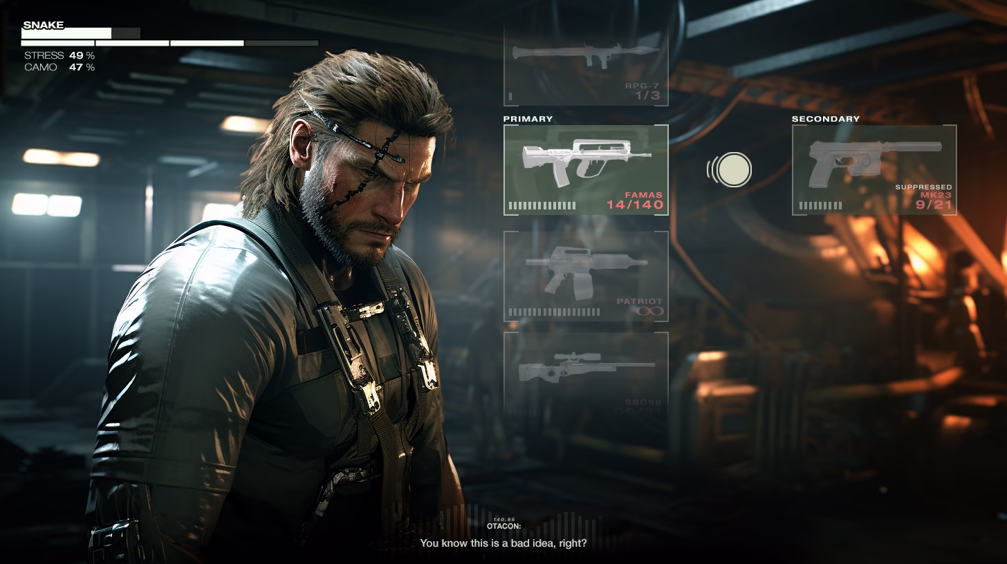 Ammo, weapons, camo — everything you need, nothing you don’t. Clean lines, bold info, and a layout that never gets between you and your next questionable stealth decision. The codec and dialogue windows tip their hat to the OG series, but without the 90s jank.